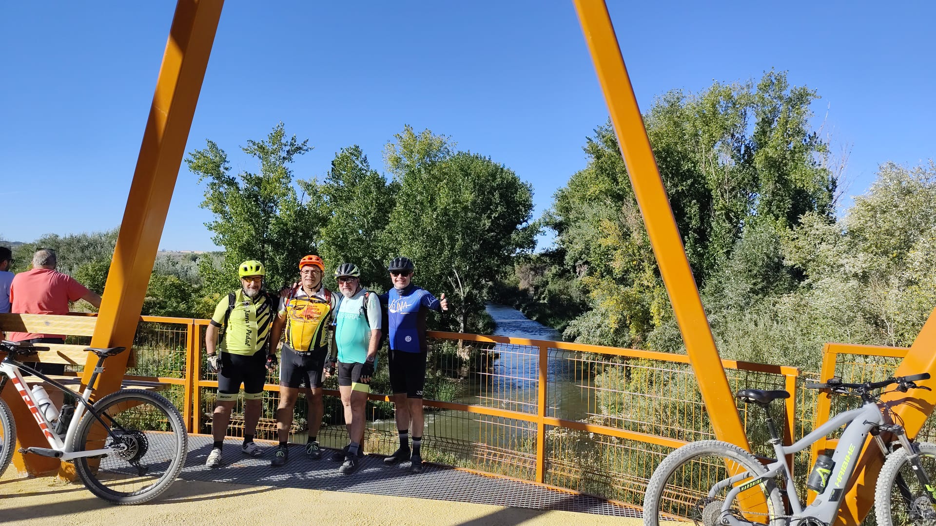Luis, Clemente y Manolo, parece que no se anima nadie más y sale la propuesta para la ruta de hoy. Los Hueros por el camino de tierra, iniciamos la marcha por la vía de escape para salir del pueblo o sea los chopos cruzamos el puente del moco debajo de la M-50 vemos un A3 clavado en las arenas movedizas del río 🤣 continuamos buscando hueco entre la perrera y el castillo de Aldovea esperemos que después de las obras nos dejen un paso como Dios manda , pasamos el cementerio de Torrejon siguiendo el curso del río hasta cruzarlo por el puente de los faisanes seguimos dejando el Viso a nuestra izquierda camino pedregoso hasta llegar a las nuevas urbanizaciones de los Hueros cruzando e pueblo para ir ascendiendo a las antenas y para hacerlo más interesante subimos por el camino de tierra que está tan seco y con piedras sueltas que derrapan las ruedas pero subimos como unos jabatos , continuamos hasta la pista de aeromodelismo y bajamos a Valverde de Alcalá buscando el camino de regreso, hoy había motos saltando y despacio volvemos para tomar unas cervezas, vino, Coca-Cola 🐞