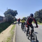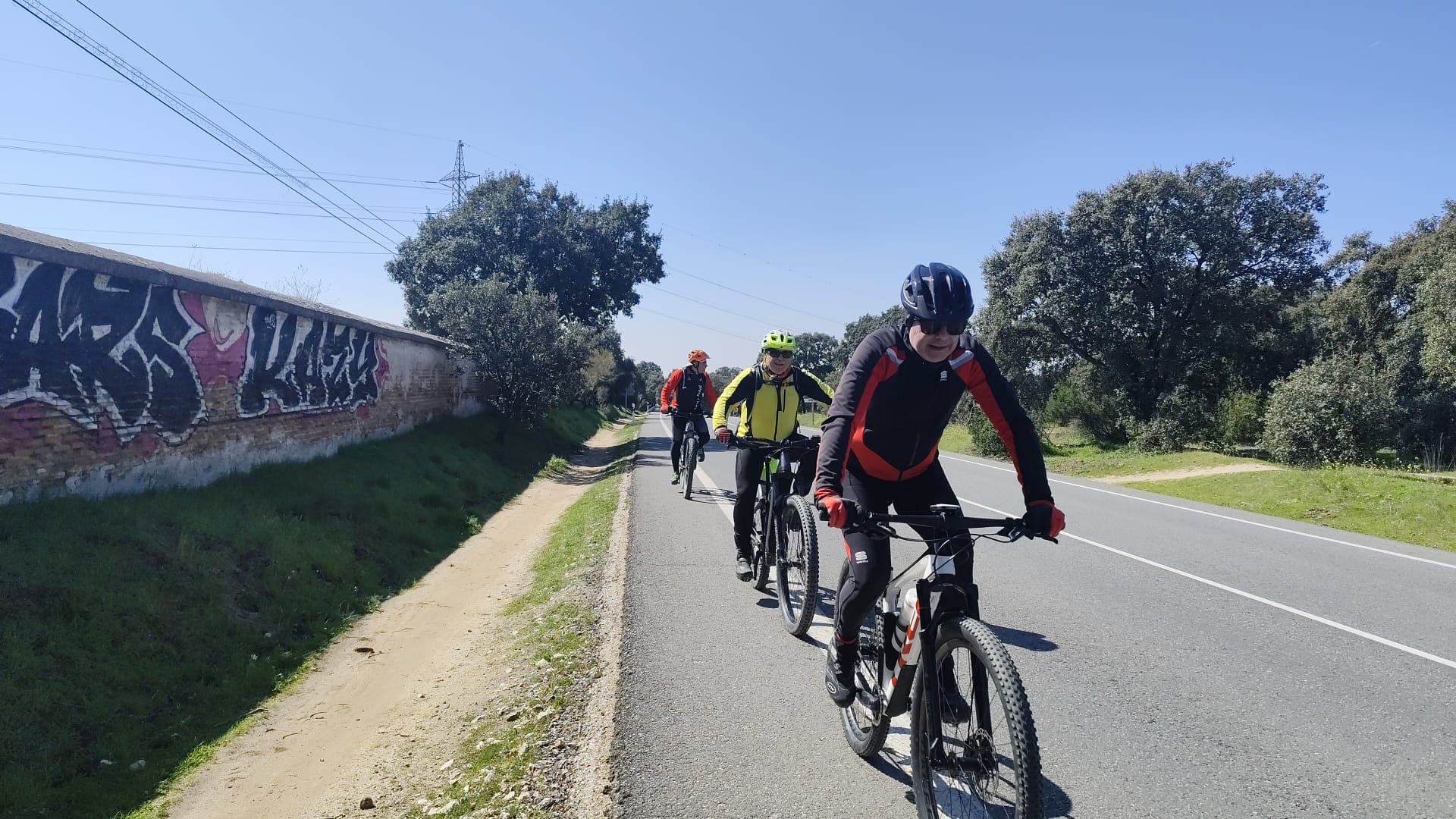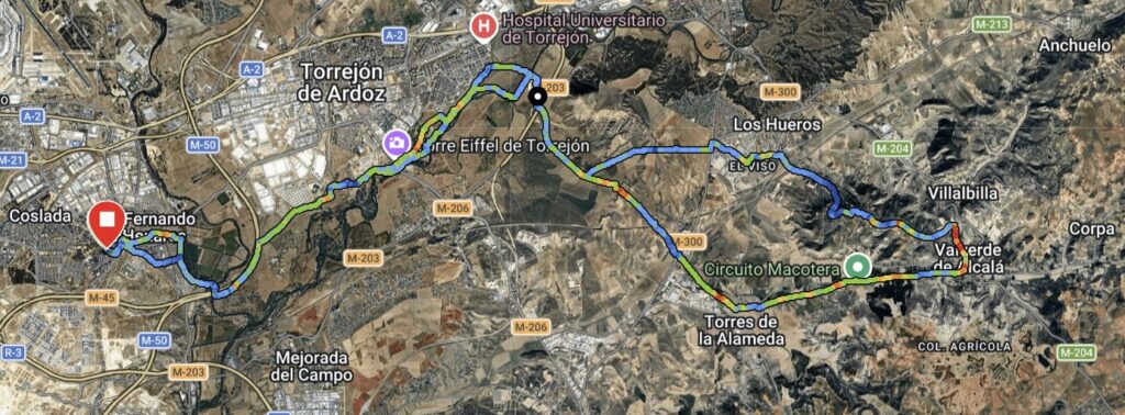 A los Hueros, como casi siempre bajamos a los chopos pasamos el puente del moco camino de Torrejon, cementerio del mismo municipio, bajando al río Henares, Torres de la Alameda, desviamos a los Hueros atravesando las urbanizaciones, llegando al subidon que nos lleva a la cumbre donde están las antenas, seguimos pasando por donde anidan los abejarucos, más adelante se encuentra el aeródromo y bajamos a Valverde de Alcalá contemplamos el convento y nos preguntamos cuantas monjas habrá? Serán jóvenes? Habrán conocido varón? 🤣🤣🤣🤣seguimos dándole duro con el aire en contra llegamos a Torres de la Alameda cruzamos el pueblo llegamos a Torrejon atravesando el parque Europa, palacio de Aldovea volviendo al puente del moco, los chopos , parque Henares cuesta arriba, cruzamos la carretera de Mejorada entrando en el pueblo por fin, por fin en la cabaña dando rienda suelta al levantamiento de vidrio ( algunos 🐞🐞 Coca-Cola)