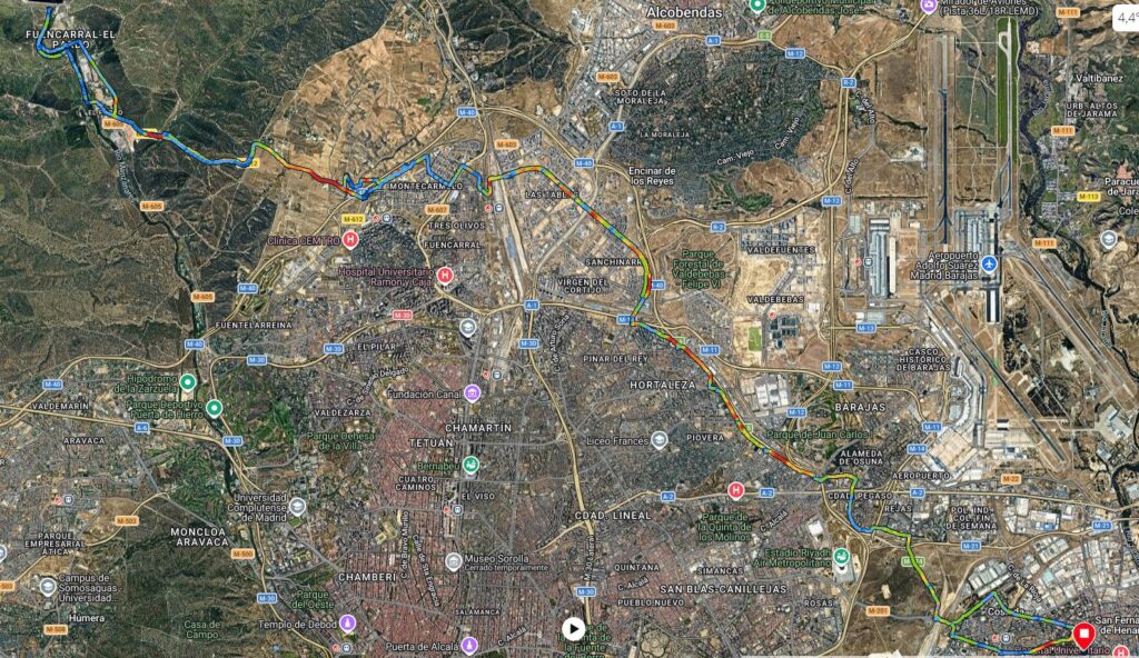 Vuelta a toda mecha y abajo cruzamos un pequeño arroyo en este punto se ha caído Paco Afortunadamente sin consecuencias incluso nos comenta que ha sido una caída cómoda que le daban ganas de no levantarse 😜cruzamos el centro comercial de la Dehesa y a la estación de Alcalá universidad, vuelta en el tren dónde nos han amenizado el viaje con música de Melendi y un Rap