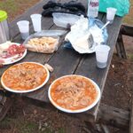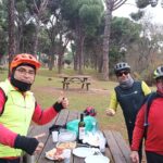A lo que vamos, el día de hoy amanece lluvioso y Mario golpeando la puerta del portal para que le abra el maletero de la bici hay que meter el avituallamiento, solamente trae un termo con callos a la madrileña, embutidos varios,queso, colines y una botella de Rioja 😜 todo para dentro, cerrado el maletero nos dirigimos al punto de encuentro en ese momento llega Juan y aparece Luis vestido de calle no se encuentra bien y se va al medico ( Luis ponte bueno, seguro que son gases)llega Ismael y arrancamos hacia Valdelatas ha estado lloviendo bastante por la noche y queremos evitar el barro que sólo da disgustos, sin prisa pero sin pausa vamos deslizandonos por el carril bici , hoy hay pocos ciclistas. Llegamos a nuestro destino, elegimos mesa para colocar el avituallamiento una vez desplegado damos buena cuenta de ello, hoy nos han faltado bikers porque ha sobrado bastante tema