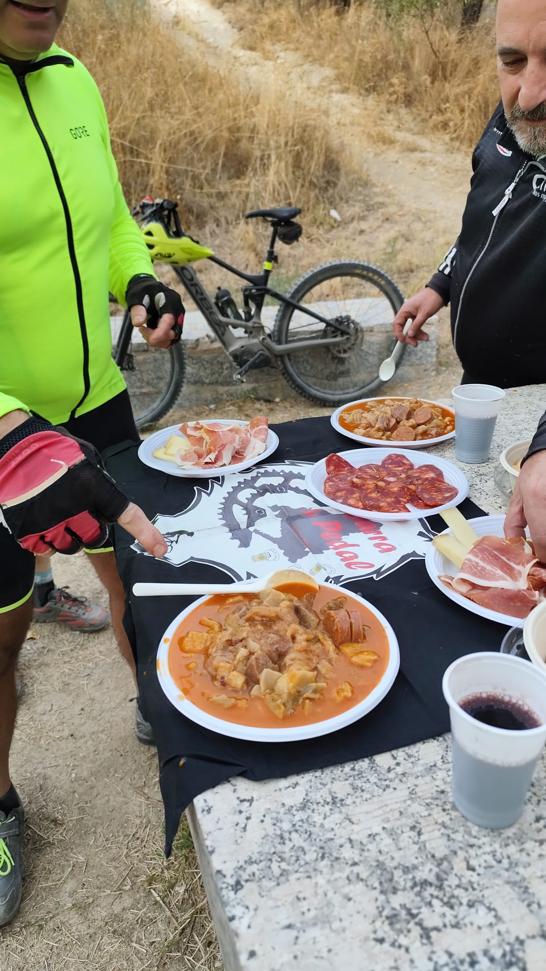«Con la mesa puesta», como si el olor de los callos hubiera activado un radar en toda la comarca, empezaron a llegar visitantes. Primero, el estruendo de tres motos de enduro que aparcaron a pocos metros, sus pilotos quitándose los cascos y mirando de reojo el festín. Inmediatamente después, un grupo sudoroso de ciclistas en «bicicletas musculares» coronó la cuesta, buscando agua en la fuente y encontrándose con un banquete. Y para rematar, un zumbido eléctrico anunció al grupo de las eMTB, que llegaron frescos como lechugas. Aquello se convirtió en una romería inesperada, un sin parar de gente saludando y comentando.