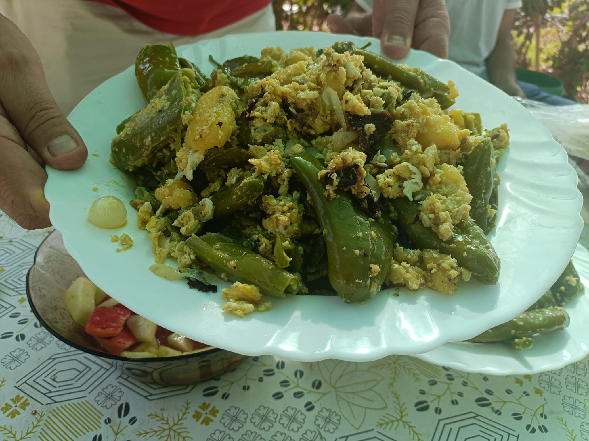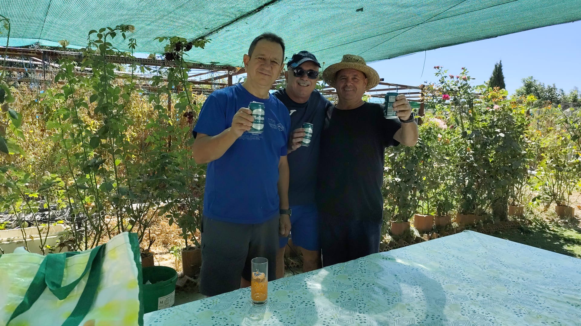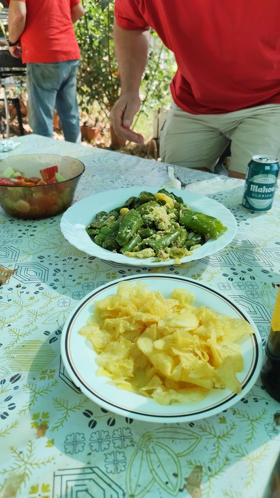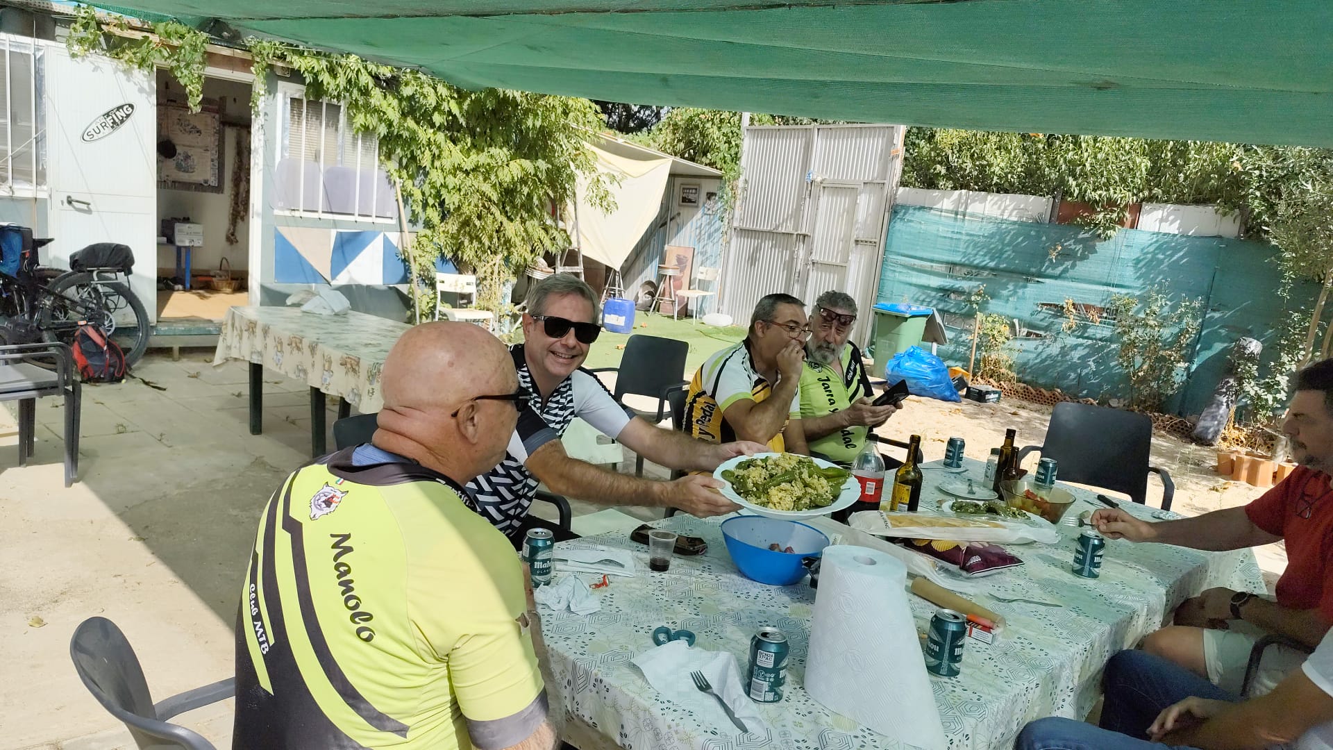 Me ayudáis a levantar y continuamos despacito hasta los huertos de los chopos donde el otro amigo Juan nos prepara unas ensaladas y unos pimientos con huevos y patatas, todos los productos del huerto con unas cervezas 🍺 🍺🍺 los más sibaritas 🍷🍷🍷y algún 🐞🧋Coca Cola «00»charla animada y promesas de hacer unos súper garbanzos con callos