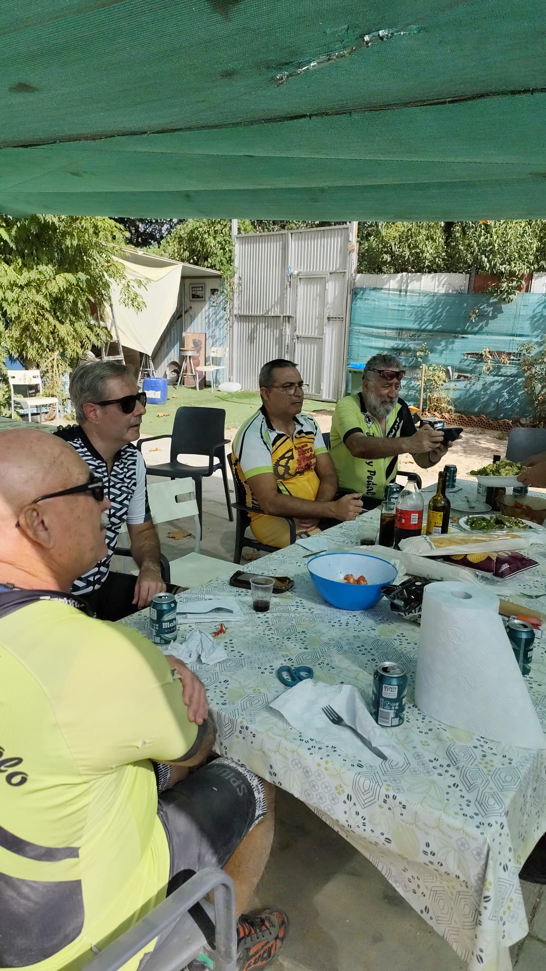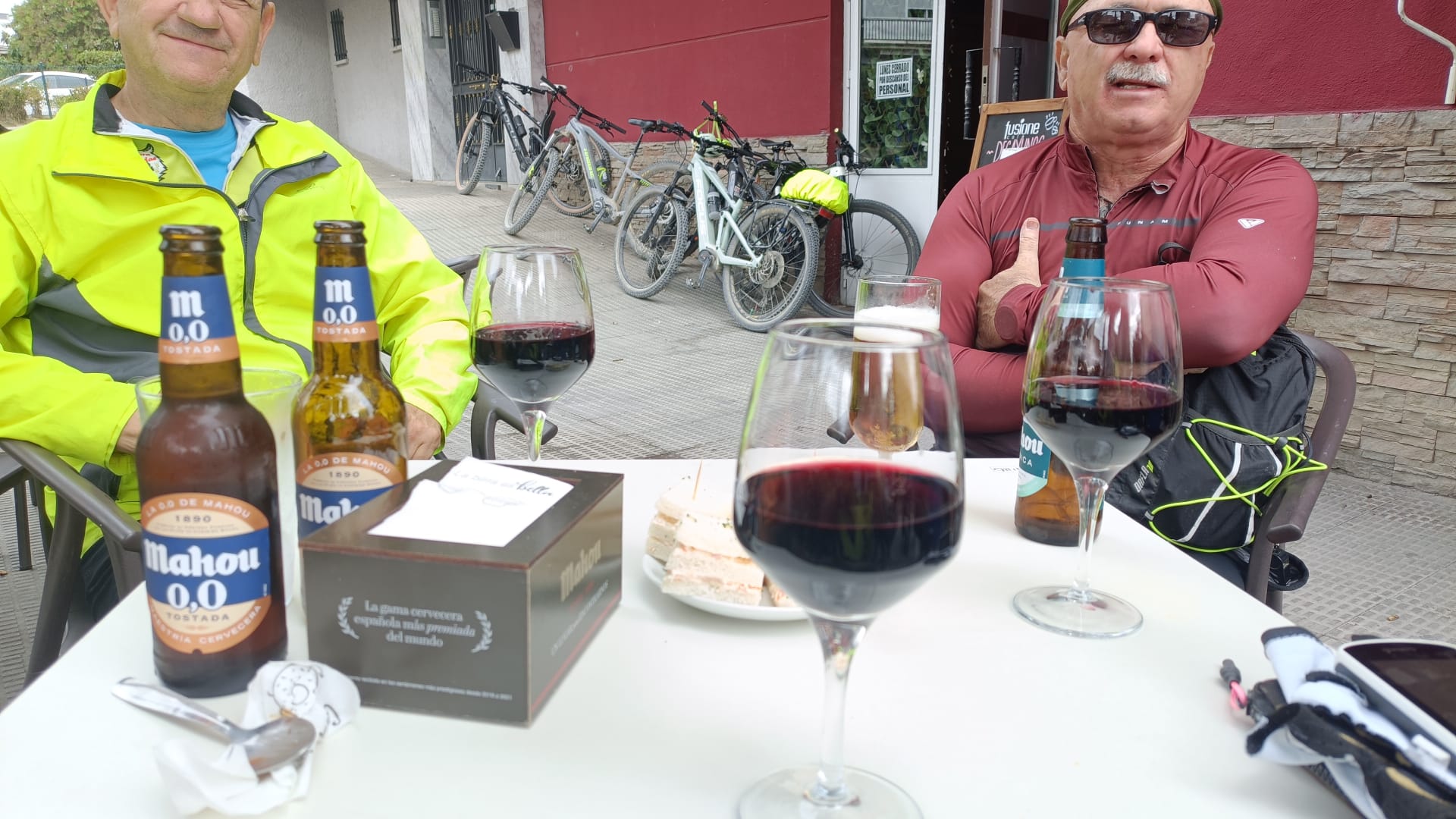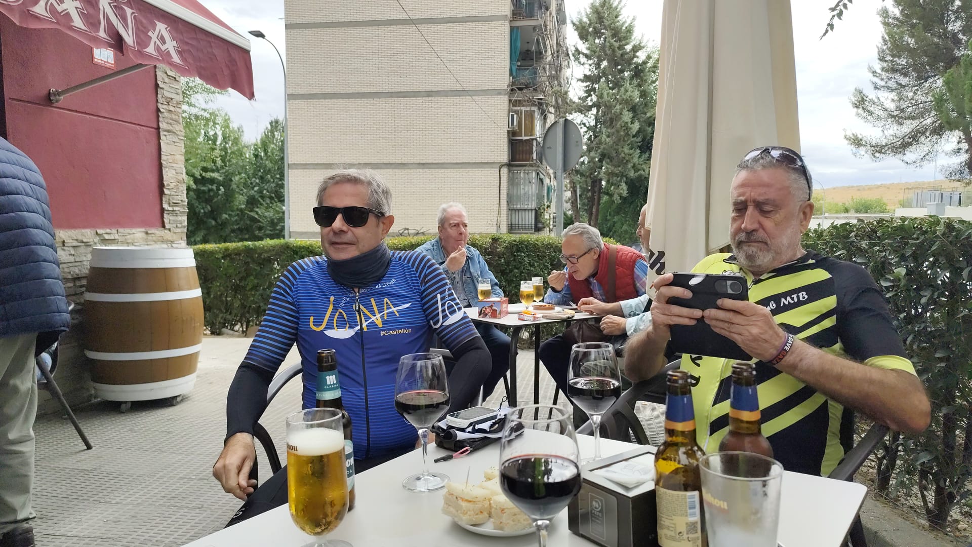 Y como todo esfuerzo merece su recompensa, al volver hicimos la parada obligatoria en Coslada, donde el bar La Cabaña nos recibió con lo que mejor sabe ofrecer: unas cervezas frías y unos vinos bien servidos. Sentados en la mesa, con las bicis aparcadas al lado, compartimos anécdotas del camino y planes para próximas salidas. El ambiente no podía ser mejor: cansancio del bueno, amigos alrededor y el sabor inconfundible de la satisfacción tras una buena ruta.